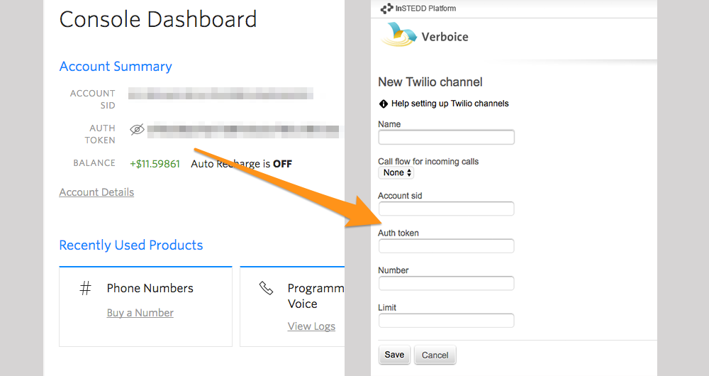 8.) In the Twilio channel configuration screen, provide a Name that will identify the channel in Surveda, set Call flow for incoming calls to the Call Flow you created in step 6, and copy the Twilio Account sid and Auth token from the Twilio console dashboard. Finally, copy the Twilio number you purchased in Step 2 to the Number field with a leading plus sign (i.e. +19702359379). The Limit field can remain blank. Click Save.