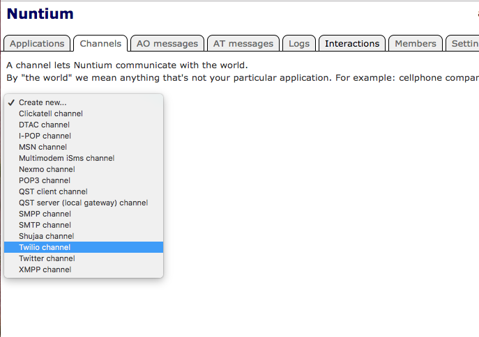 5.) Under the Channels tab, select Twilio channel from the drop down menu.