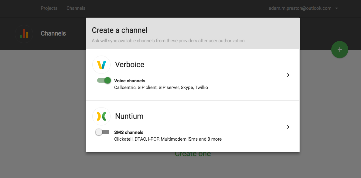 3.) Log into Surveda, and navigate to the Channels screen. Create a new channel by clicking on the green plus button and toggle on Verboice to enable a Verboice channel. A new window will pop up asking for your newly created Verboice account login credentials.